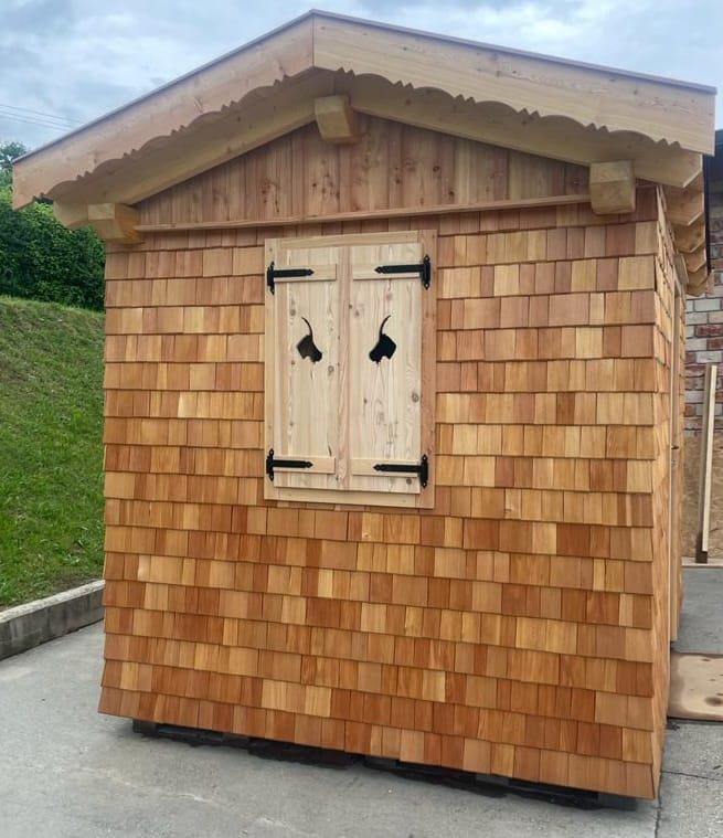 Außen erhält die Hütte eine hochwertige Fassade aus heimischen, handgespaltenen Lärchenschindeln oder einer individuellen Holzschalung nach Wunsch. Dank der Vollisolierung von Boden, Wänden und Decke (17 cm Isolierung, 25 cm Wandstärke) ist die Hütte bestens für unterschiedliche Witterungsbedingungen geeignet und sorgt für angenehme Temperaturen zu jeder Jahreszeit.