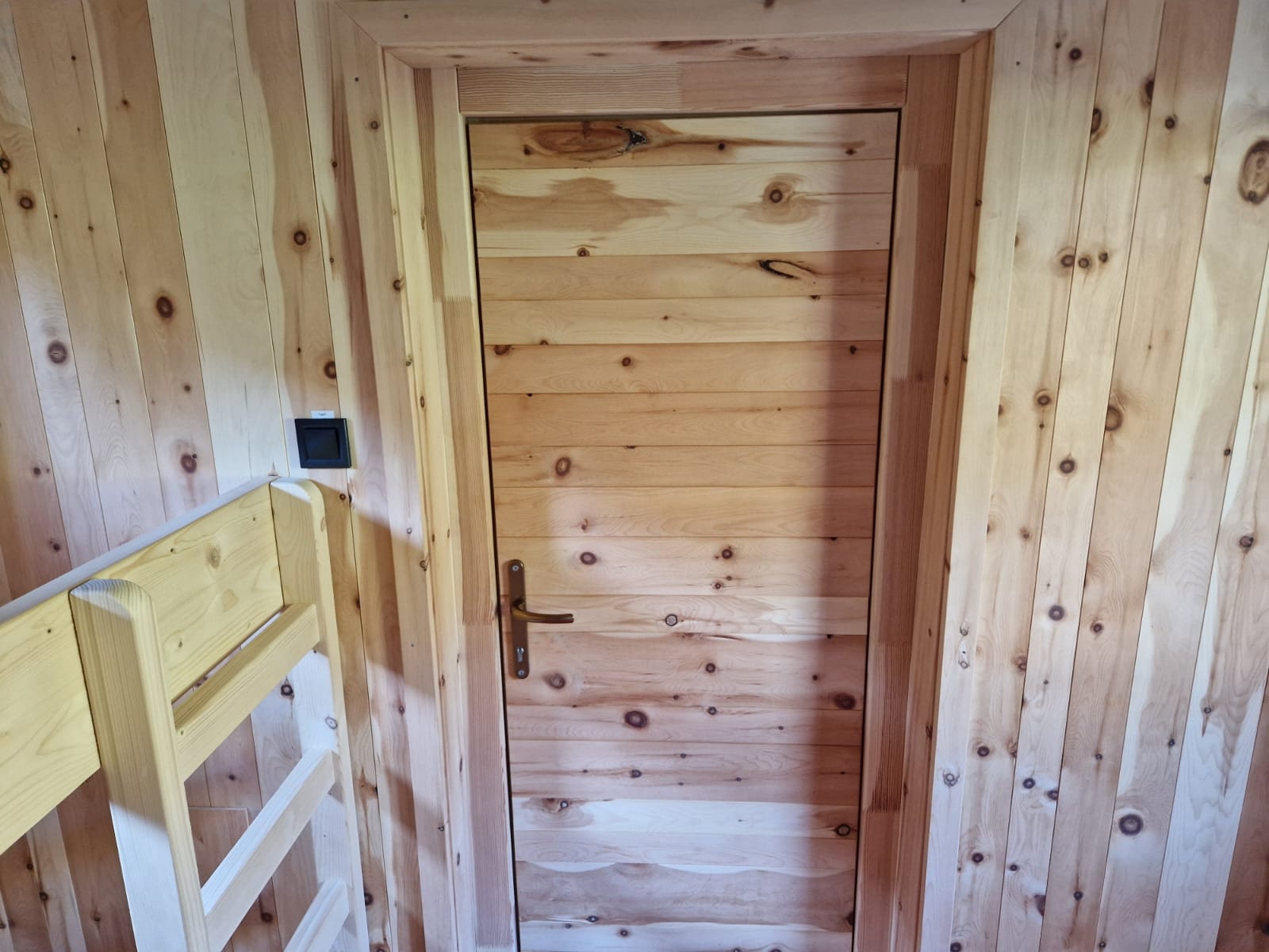 Im Innenraum lädt eine kleine, gemütliche Sitzecke zum Verweilen ein. Ein praktisches Stockbett bietet Schlafmöglichkeiten für zwei Personen, während mehrere Regale ausreichend Stauraum für persönliche Gegenstände schaffen. Das Herzstück der Hütte ist der charmante Holzofen, der wohlige Wärme spendet und für eine besonders heimelige Stimmung sorgt.