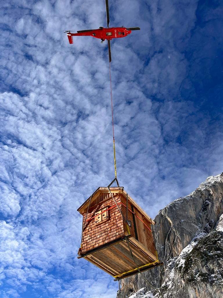 Die kleine mobile Berghütte (Transport auch mit Helikopter möglich) bietet auf kompakten 2 x 3 Metern Innenfläche ein gemütliches, perfekt durchdachtes Raumkonzept. Die Innenwände sind wahlweise mit Zirben- oder Fichtenholz verkleidet und schaffen eine warme, natürliche Atmosphäre. Der Boden besteht aus robustem Lärchen- oder Fichtenholz und rundet das behagliche Wohngefühl ab. Die Hütte in der Größe ist genehmigungsfrei und kann sehr gut auch als Gartenhütte genutzt werden.